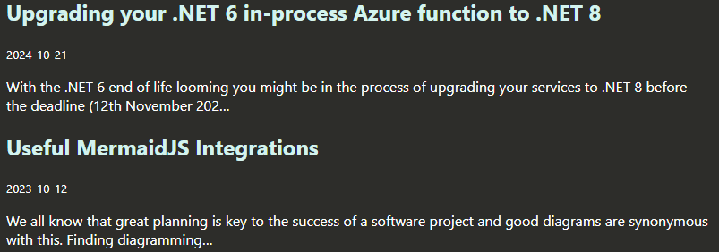 - Semantic heading structure is clean (h1 for page title, h2 for post titles/dates).